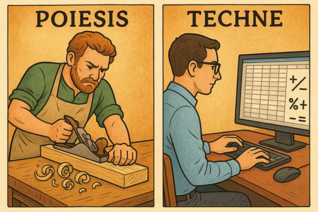Techne to sztuka, rzemiosło i praktyczna wiedza o tworzeniu czegoś (technologia).